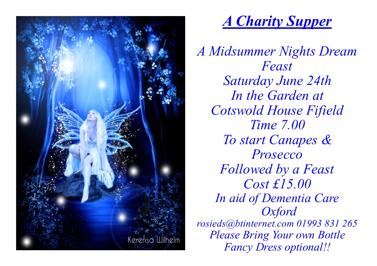 summer charity supper 2023 flyer A Midsummer Nights Dream Feast Saturday June 24th In the Garden at Cotswold House Fifield Time 7.00pm To start Canapes & Prosecco Followed by a …